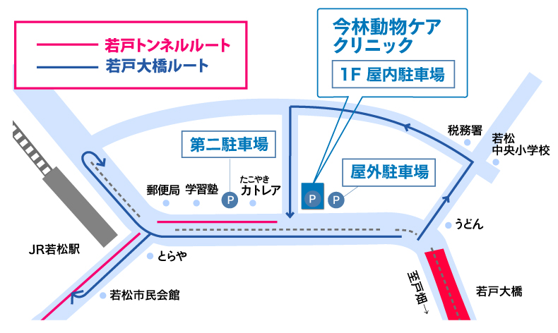 屋内駐車場6台、屋外駐車場5台、第二駐車場5台の駐車スペースを完備しております。 ※病院前の歩道への駐車はご遠慮下さい。 若戸大橋戸畑方面から来られた際は、病院前の道路は中央に柵がある為、右折しての進入ができません。 裏から回るか、Uターンが必要となります。地図をご参照下さい。