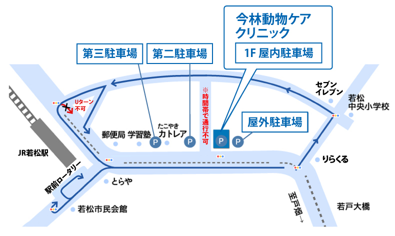 屋内駐車場6台、屋外駐車場5台、第二駐車場8台、第三駐車場5台の駐車スペースを完備しております。 ※病院前の歩道への駐車はご遠慮下さい。 若戸大橋戸畑方面から来られた際は、病院前の道路は中央に柵がある為、右折しての進入ができません。 裏から回るか、Uターンが必要となります。地図をご参照下さい。